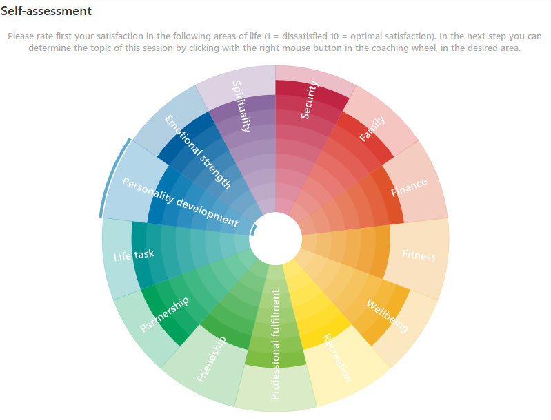 コーチングというとビジネス領域での手法と認識されているかと思いますが、このコーチングホイールで扱う領域は、スピリチュアリティ、安全、家族、金融、フィットネス、ウェルビーング、余暇、職業的な満足感、友人、パートナーシップ、ライフタスク、個人的成長、感情の強さといった多岐にわたるものです。