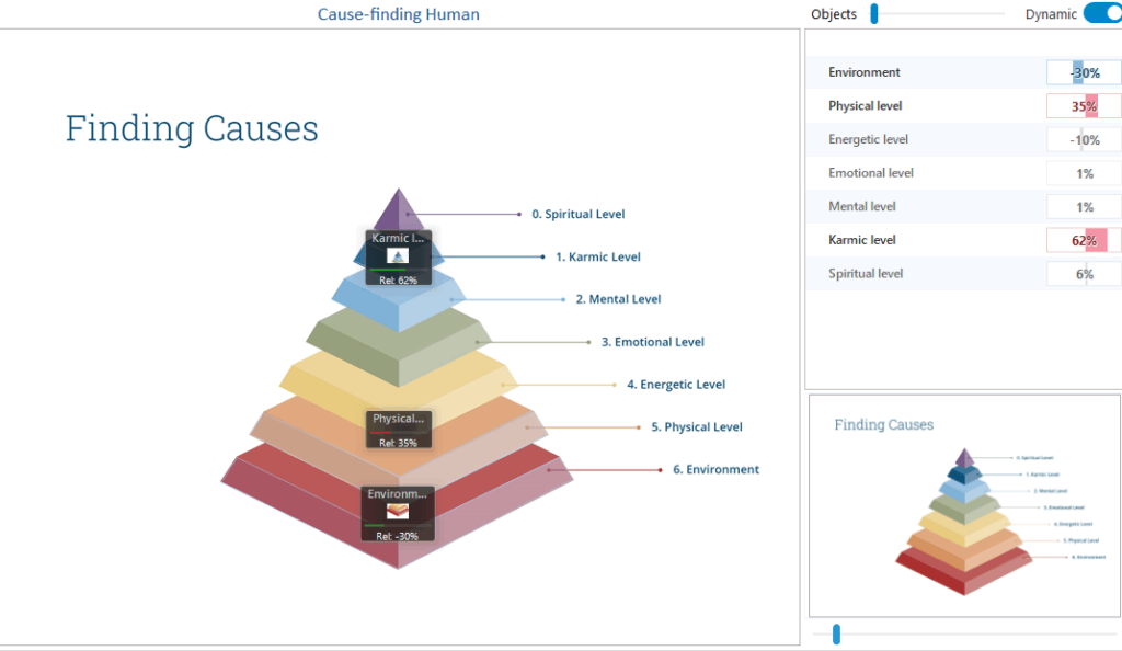クライアント様ご本人の7つの階層(環境、身体レベル、エネルギーレベル、感情レベル、精神レベル、カルマレベル、スピリチュアレベル)のどこに大きなテーマを持っているか分析し調整するモジュールです。