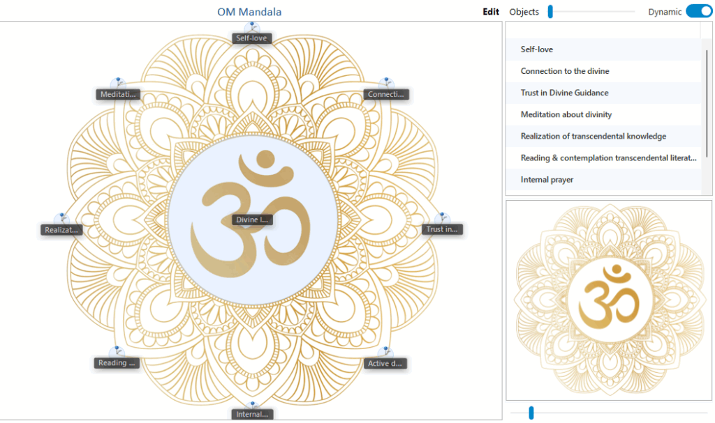 神聖なる愛(Divine love)を中心としたご自身のあり方を他の8つの領域(自己愛、ディバインとの繋がり、ディバインについての瞑想、超越した意識の実現、超越的なものへのリーディングと解釈、内なる祈り、積極的な献身・奉仕)から分析調整します。