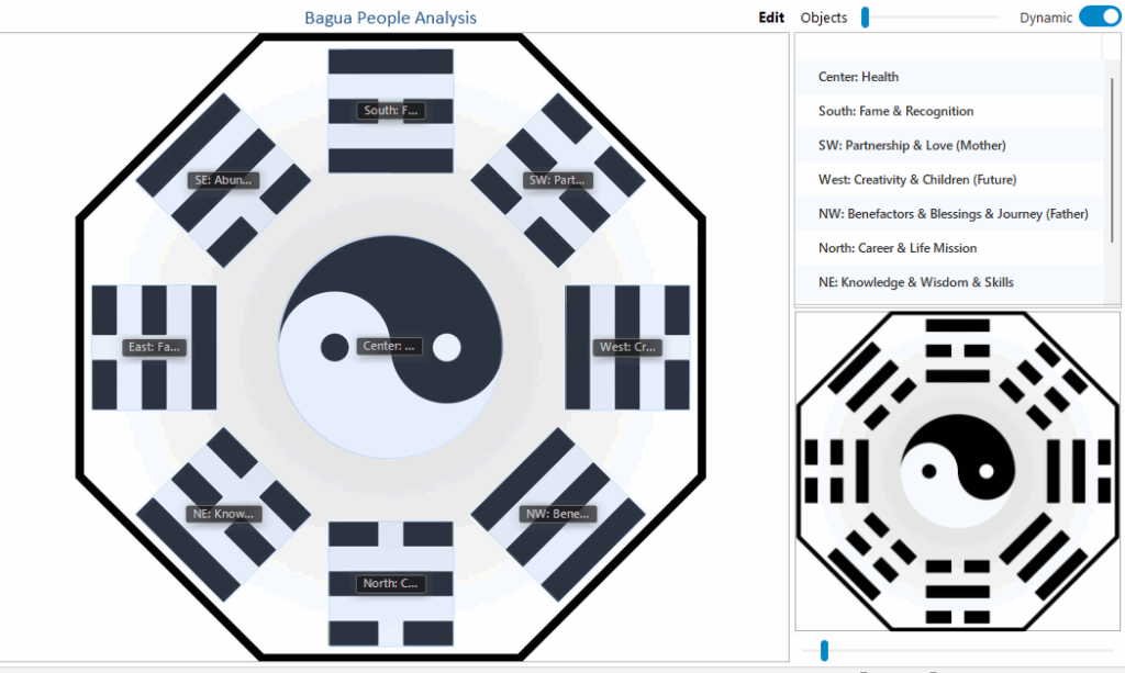 中心:健康、南:運命&悟り、南西:パートナーシップ&愛(母)、西:創造性&子ども(未来)、北西:恩人&祝福&旅(父)、北:仕事&人生の使命、北東:知識&叡智&スキル、東:家族&基盤(過去)、南東:豊かさ&富&繁栄