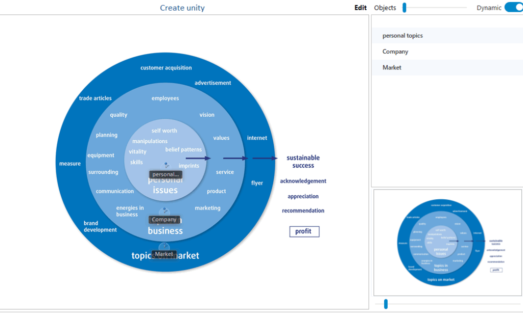 個人→企業→市場を、一貫性のある統一された軸を持ちながら、認知され、感謝され、推薦されて結果として利益に結び付くながれを創っていきます。