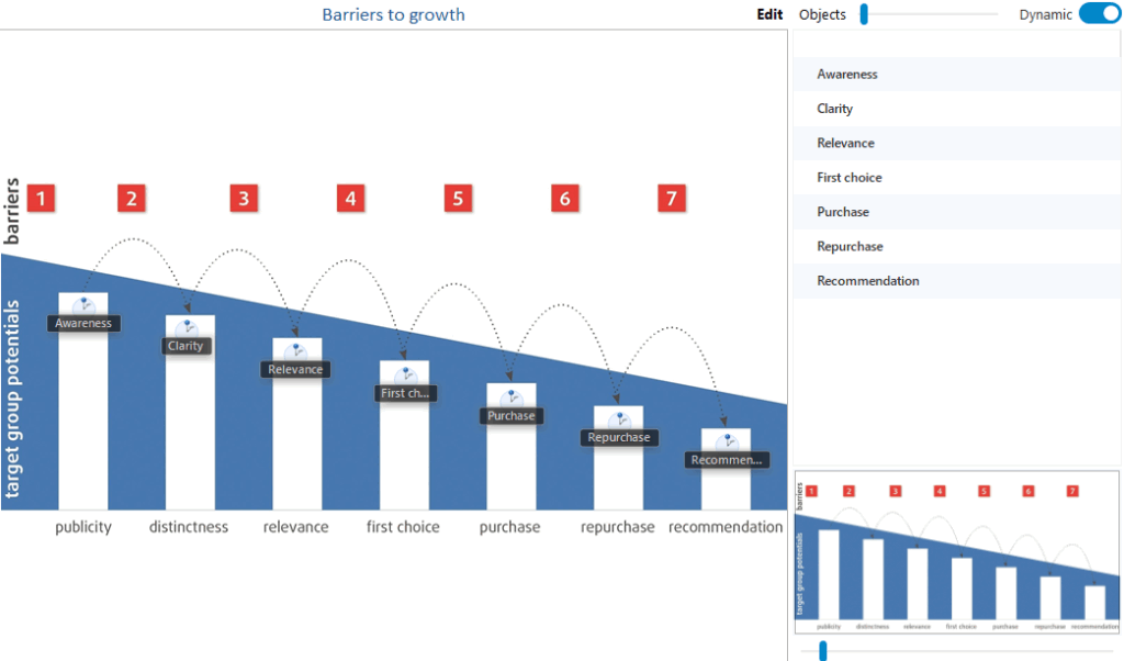 ビジネスが成功するには流れがあります。そのどの段階(宣伝認知-差別化-妥当性-第一選択力-購入-再購入-推薦力)に課題があるのか、明確化します。